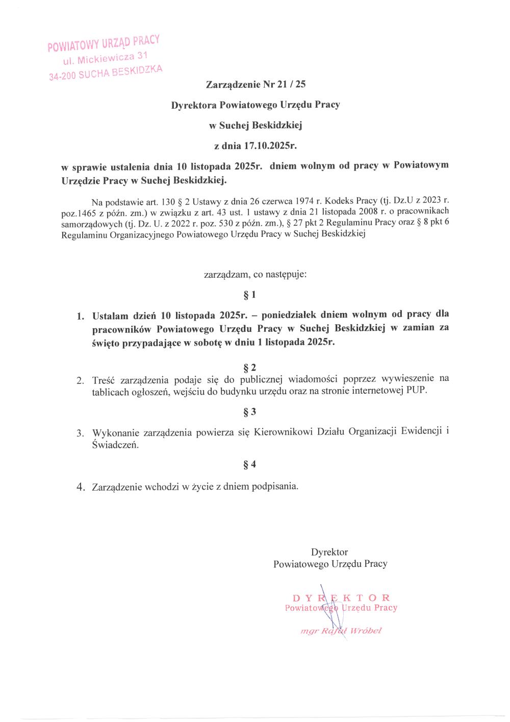 Zarządzenie - w sprawie ustalenia dnia 10 listopada 2025r. dniem wolnym od pracy w Powiatowym Urzędzie Pracy w Suchej Beskidzkiej. - Powiatowy Urząd Pracy w Suchej Beskidzkiej